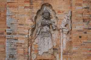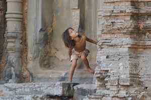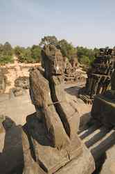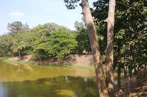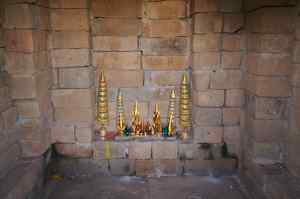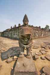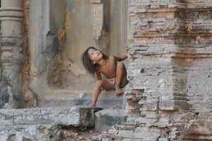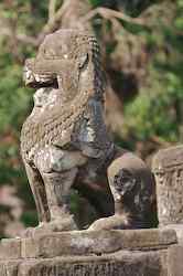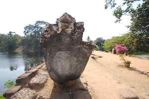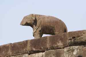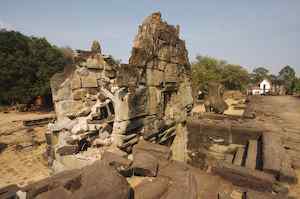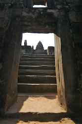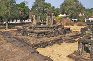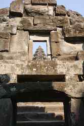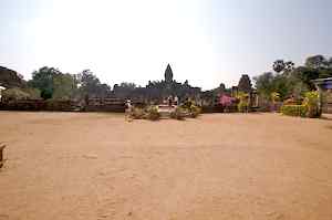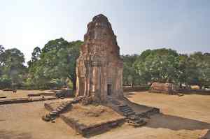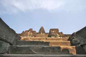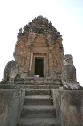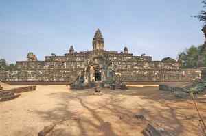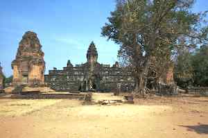 The Bakong is the first real pyramidal shaped temple built in Cambodia to take the form which researchers have come to call "temple mountain". Before entering an enclosure measuring 400 by 300 meters which is surrounded by an exterior wall and a moat somewhat wider than it is deep, we find ourselves in a larger enclosure measuring 900 by 700 meters. In this outer enclosure, ruins and remains of at least 22 sanctuaries are found. These sanctuaries can perhaps be considered satellites of the central complex in that some of them, instead of facing east, turn to face the central pyramid. The naga (serpent) with seven heads found on the side of the entrance causeway appears here for the first time in the place which will be taken by future naga balustrades. The brick towers, located at the foot of the pyramid, still have their original wooden supporting beams despite the ravages of time. |