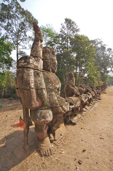 Caption: Victory Gate Ankor Thom: the last of the statues has the tail of the snake