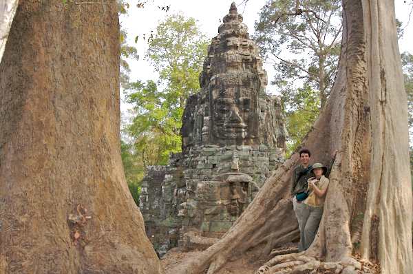 Caption: Victory Gate Ankor Thom: Beth and Michael with the trees on top of the wall