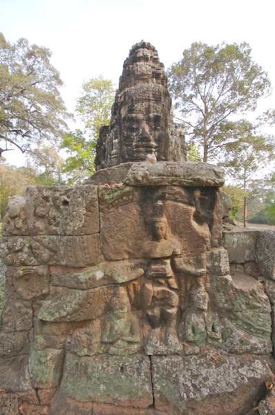 Caption: Victory Gate Ankor Thom: carving detail on top of the wall in front of the giant head