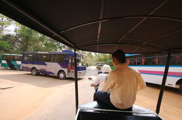 Caption: Leaving angkor thom, look at all the tour busses