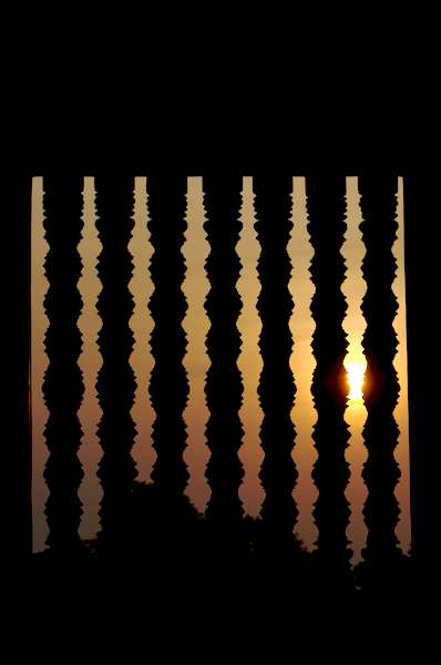 Caption: Ankor Wat: sunrise coming through colums in a wiindow