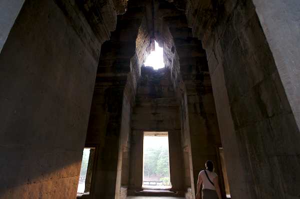 Caption: Ankor Wat: Beth in hallway with damaged ceiling