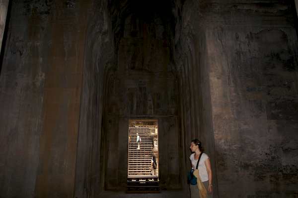 Caption: Ankor Wat: Beth in a room with doorway with wooden steps leading to the outside