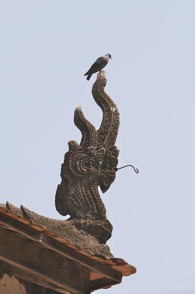Caption: Lolei: Decorative naga with pigeon on the eave of the modern temple