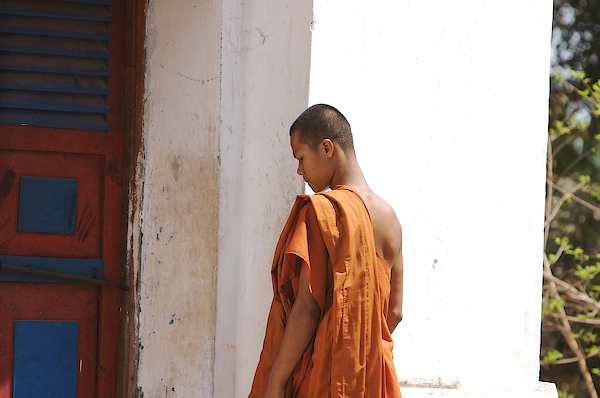 Caption: Lolei: a monk entering the modern temple