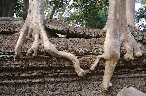 Caption: Ta Prohm: detail of trees dismantling wall
