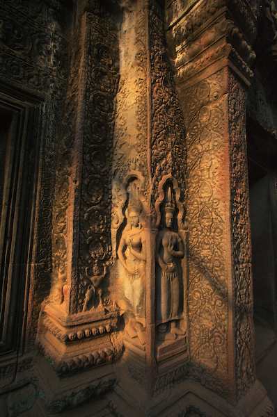 Caption: Ta Prohm: carvings lit by fantastiv light