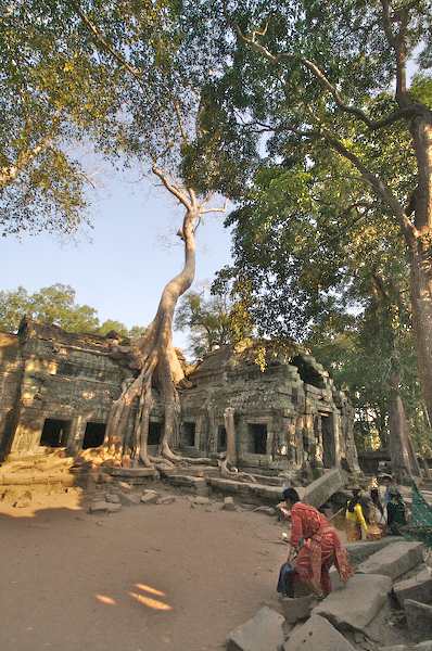 Caption: Ta Prohm: tree overtaking building in a croner of the courtyard