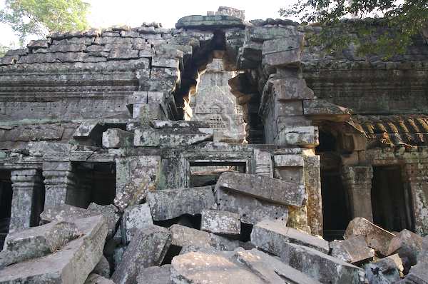Caption: Ta Prohm: looking through a partially collapsed doorway blocked by rubble
