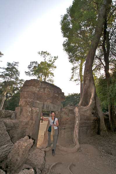 Caption: Ta Prohm: Beth with doorway and tree roots