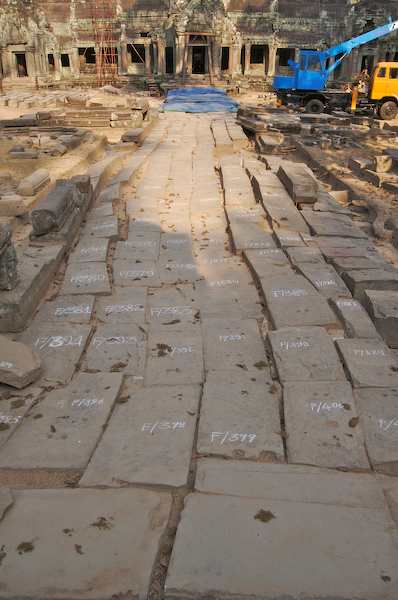 Caption: Ta Prohm: walkway with blocks numbered for restoration and crane