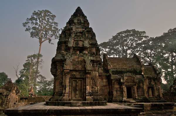Caption: Banteay Srei: side view of tower and building