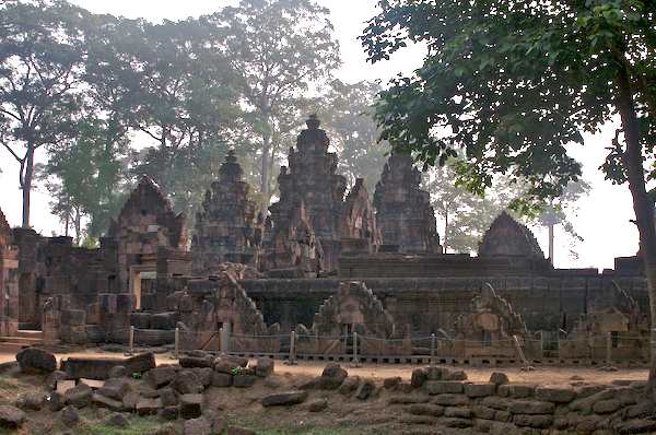 Caption: Banteay Srei: temple and trees at dawn