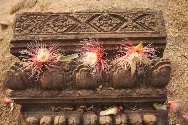 Caption: Banteay Srei: flowers fallen on carved stone