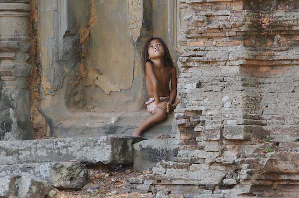 Caption: Bakong: Little girl watching tamarind being shaken out of tree