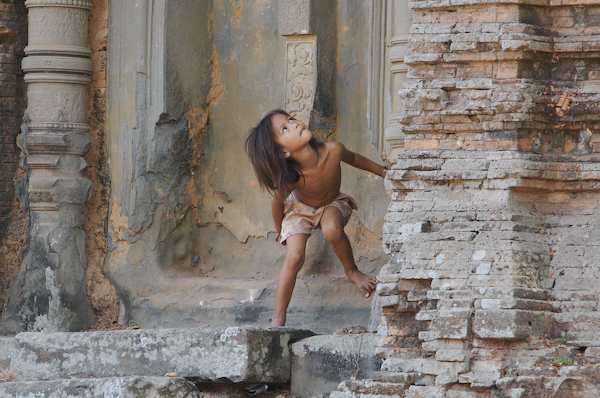 Caption: Bakong: Little girl watching tamarind being shaken out of tree