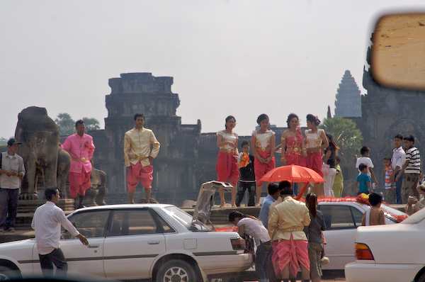 Caption: A local wedding posing for pictures in front of Angkor Wat