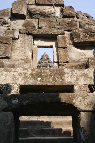 Caption: Bakong: Steps and central tower visible through dorway detail