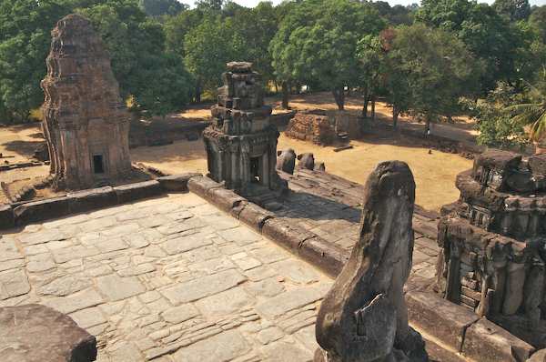 Caption: Bakong: Looking down, the remains of a lion, and elephants on the corner