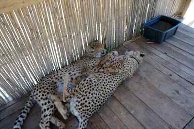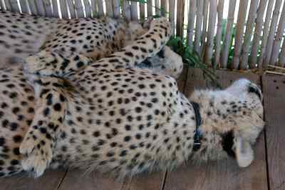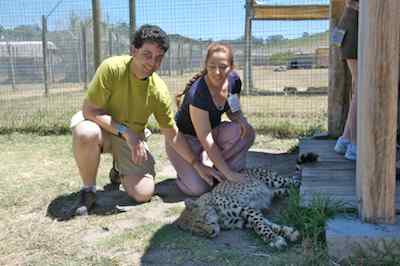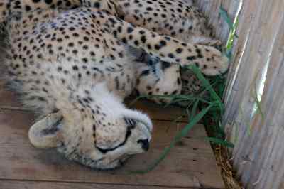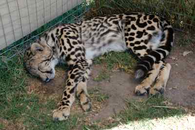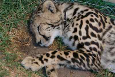 The CCUSA crew drove us all over creation... Past Table Mountain and by the Nuclear Reactor whch was right by the road... To the Speir winery, and right next door, a cheetah educational facility, where we were able to pat the baby Cheetah... they were pretty big, but not quite adult. Some spots for Judy Cheetah sleep more than 18 hours a day, these didn't care that we were there, but one did bother to look up for a few seconds. One of the cubs had a rare mutation called King Cheetah, where the black spots turn into larger patches. The ones lying in the grass by themselves are adults, you can see the difference in the size and shape of the head |