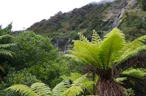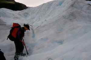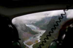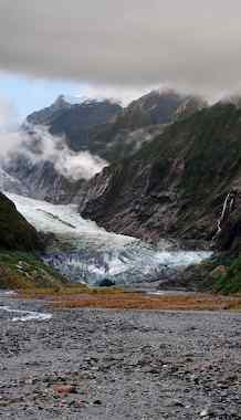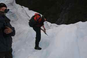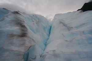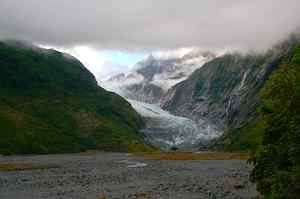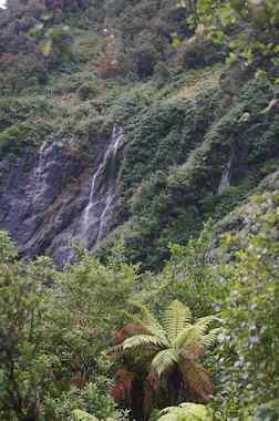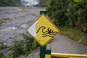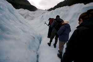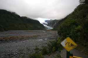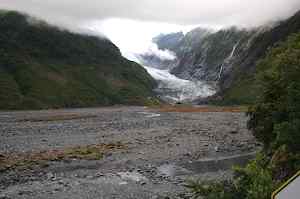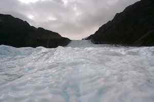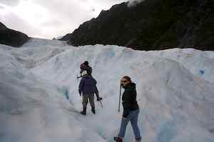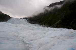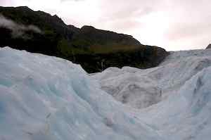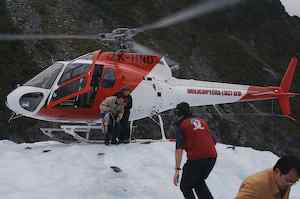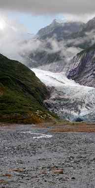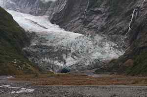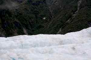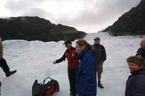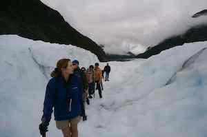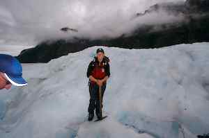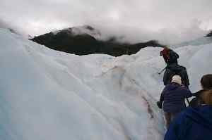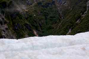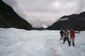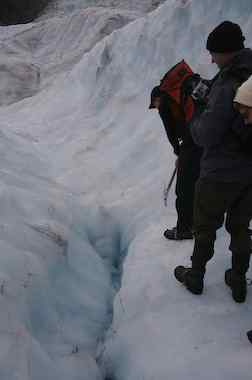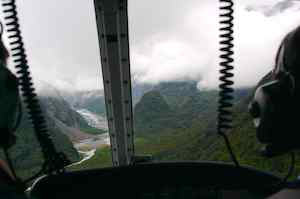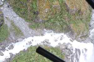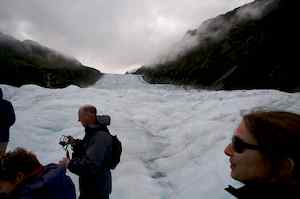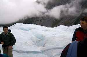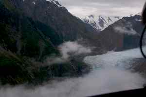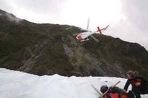 The next morning we got up early and drove to the end of the Franz Joseph Glacier I love that sign... Below are two vertical composites that give you a sense of the weather and the spectacular vista From Franz Joseph, we drove down to Fox Glacier and took a helicopter flight up onto the glacier The helicopter made three trips to get us all out onto the glacier. We walked around on the glacier for awhile |